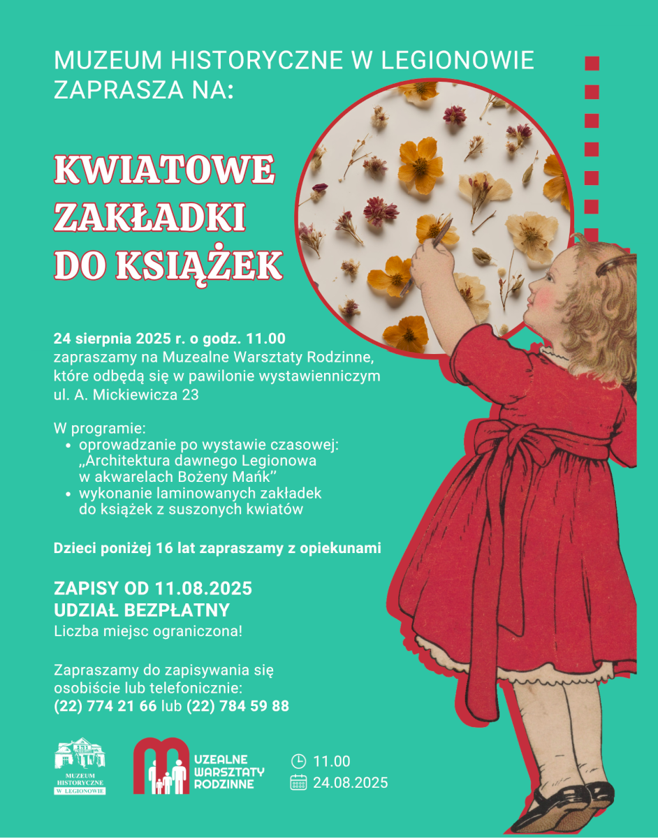 Zapraszamy na Muzealne Warsztaty Rodzinne „Kwiatowe zakładki do książek” - 24 sierpnia 2025 r. (niedziela) godz. 11.00, pawilon wystawienniczy Muzeum Historycznego w Legionowie, ul. A. Mickiewicza 23. W programie oprowadzanie po wystawie czasowej „Architektura dawnego Legionowa w akwarelach Bożeny Mańk” oraz wykonywanie z suszonych kwiatów laminowanych zakładek do książek. Dzieci poniżej 16 lat zapraszamy z opiekunami. Liczba miejsc ograniczona.