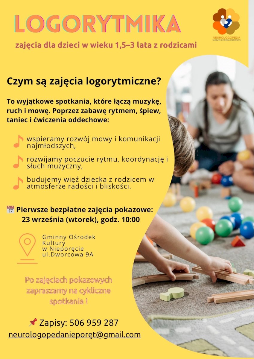 Zapraszamy na lekcję pokazową logorytmiki – połączenie zabawy, rytmu i ćwiczeń mowy! Zajęcia skierowane są do dzieci w wieku 1,5–3 lata wraz z opiekunami.