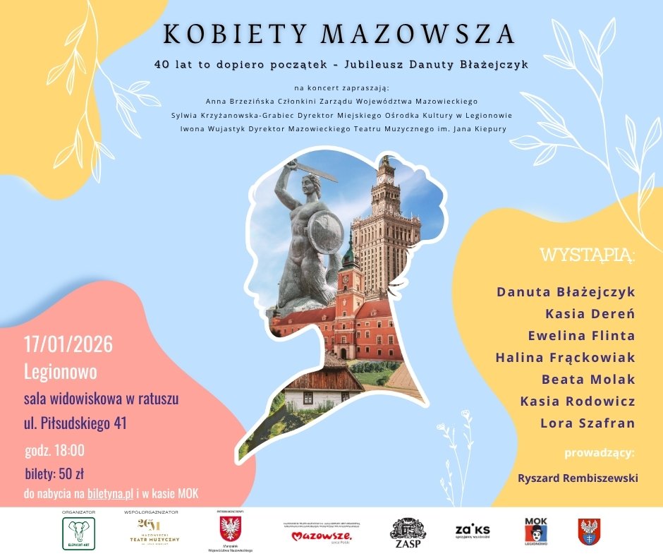 17 stycznia 2026 r. o godz. 18:00 w sali widowiskowej legionowskiego ratusza odbędzie się wyjątkowy koncert świętujący cztery dekady działalności artystycznej Danuty Błażejczyk. W muzycznym wydarzeniu „Kobiety Mazowsza – 40 lat to dopiero początek - Jubileusz Danuty Błażejczyk” wystąpią znakomite wokalistki: Danuta Błażejczyk, Kasia Dereń, Ewelina Flinta, Halina Frąckowiak, Beata Molak, Kasia Rodowicz oraz Lora Szafran.
