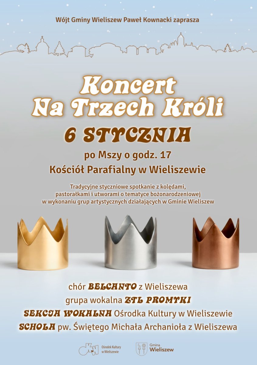 Wójt Gminy Wieliszew Paweł Kownacki zaprasza na tradycyjny Koncert na Trzech Króli, który odbędzie się 6 stycznia po Mszy Świętej o godz. 17.00 w Kościele Parafialnym w Wieliszewie.