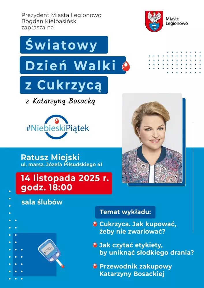Z okazji Światowego Dnia Walki z Cukrzycą Prezydent Miasta Legionowo Bogdan Kiełbasiński zaprasza mieszkańców na wyjątkowe spotkanie z Katarzyną Bosacką – dziennikarką i promotorką zdrowego stylu życia.